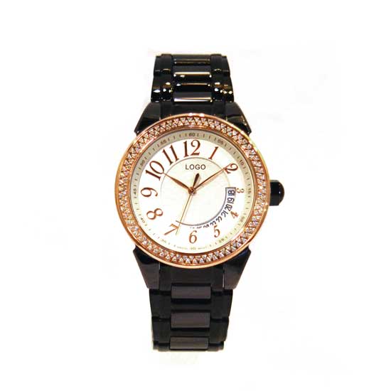 Displayed is a men's watch that comes with a white round dial and a black strap for a contrasting effect. The number markers are designed in charging font sizes for a fun style. This wristwatch is made of ceramic steel for a light weight and comfortable wearing experience.