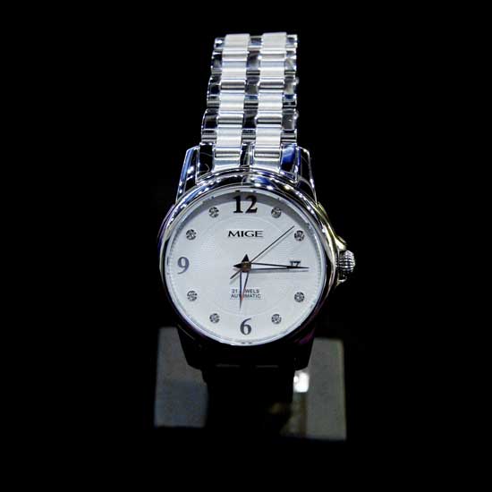 This is a men’s watch that features a stainless steel watch band in silvery. The round dial face has a date display, three hands and an Arabic numeral display. This well-designed wristwatch is an ideal choice for modern men.