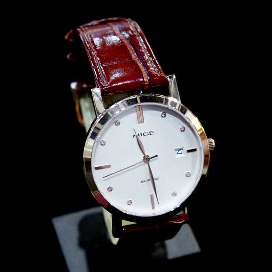 This chic men’s quartz watch features a red leather strap for a soft and comfortable fit on your wrist. The classic round case is made of top-quality stainless steel. The white dial face has three hands, a date display and precise hour markers.