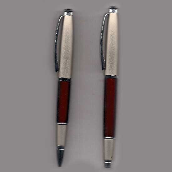 Outlined here is a set of writing instruments with a metal barrel. A ball pen and a roller pen is included. This metal ball pen set offers you smooth writing experience.