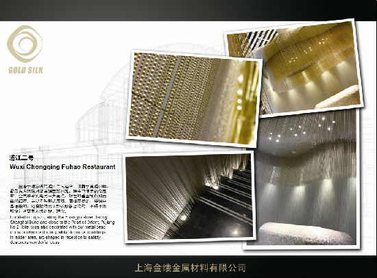 We mainly produce architectural wire mesh products, such as coil drapery, metal fabrics, metallic cloth, wire drapery, metal bead curtain etc, which have many applications for window treatments, dividers, wall & ceiling treatments, exterior gladding and other decoration.