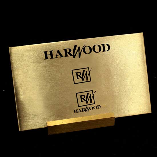 The chic brand name reminder comes in a landscape orientation. It features golden plating and a fine satin finish. The stainless steel construction promises lasting durability with resistance to corrosion. It can also be made with brass metal.