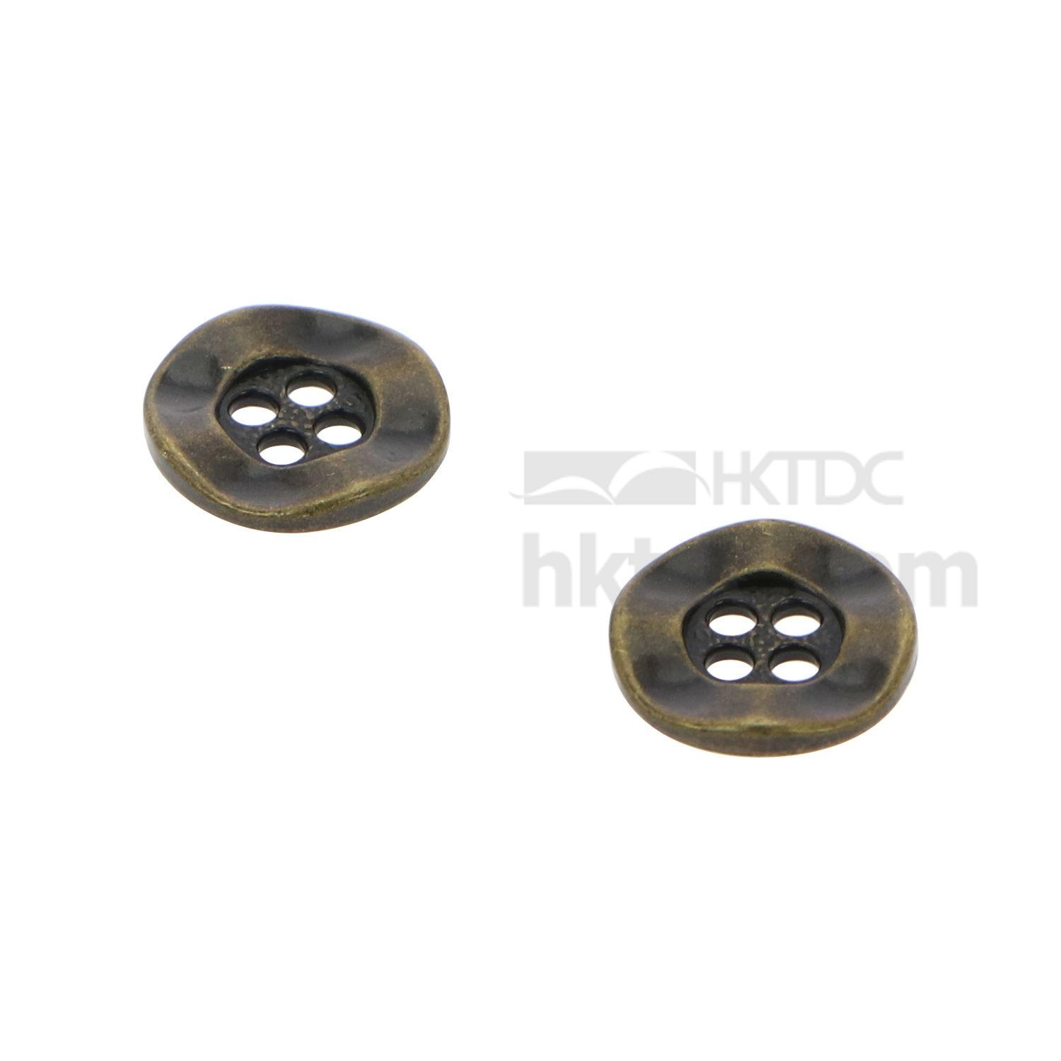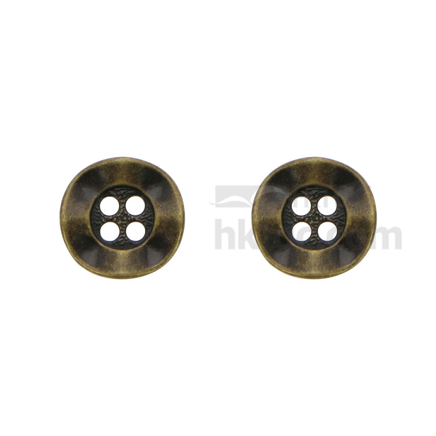 This button is made of alloy and has a round body with an uneven rim. It comes in a vintage bronze tone and has four holes for easy sewing. The alloy button is great for matching different styles and is a reliable fastener for garments, bags and more.