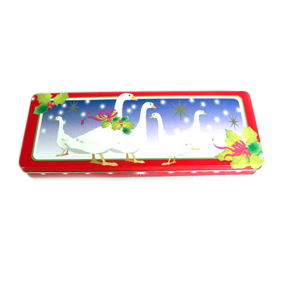This large can is made of quality metal for durability. It boasts a robust housing in a rectangular shape. This metal can is designed with delicate goose prints in bright colors for an eye-catching look.