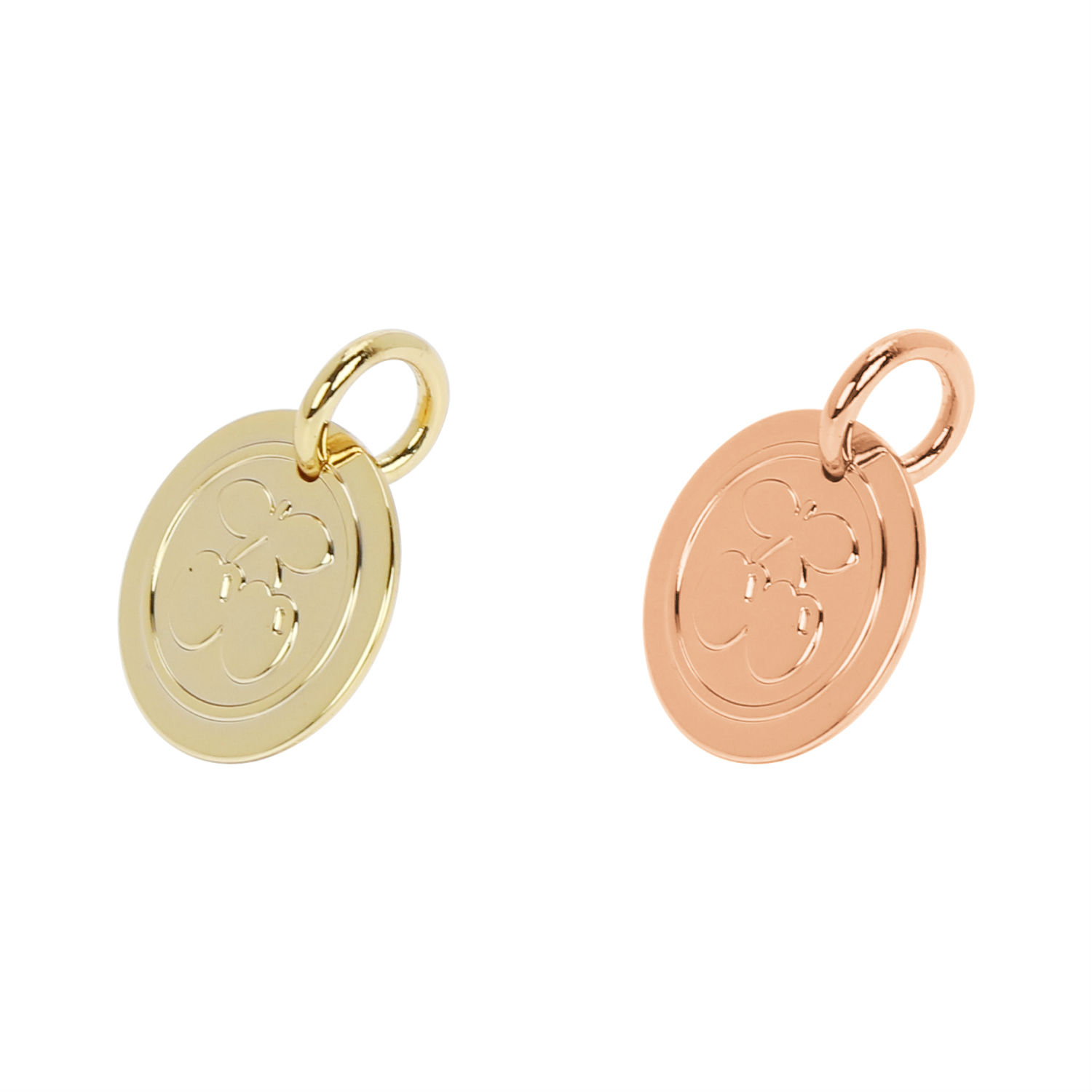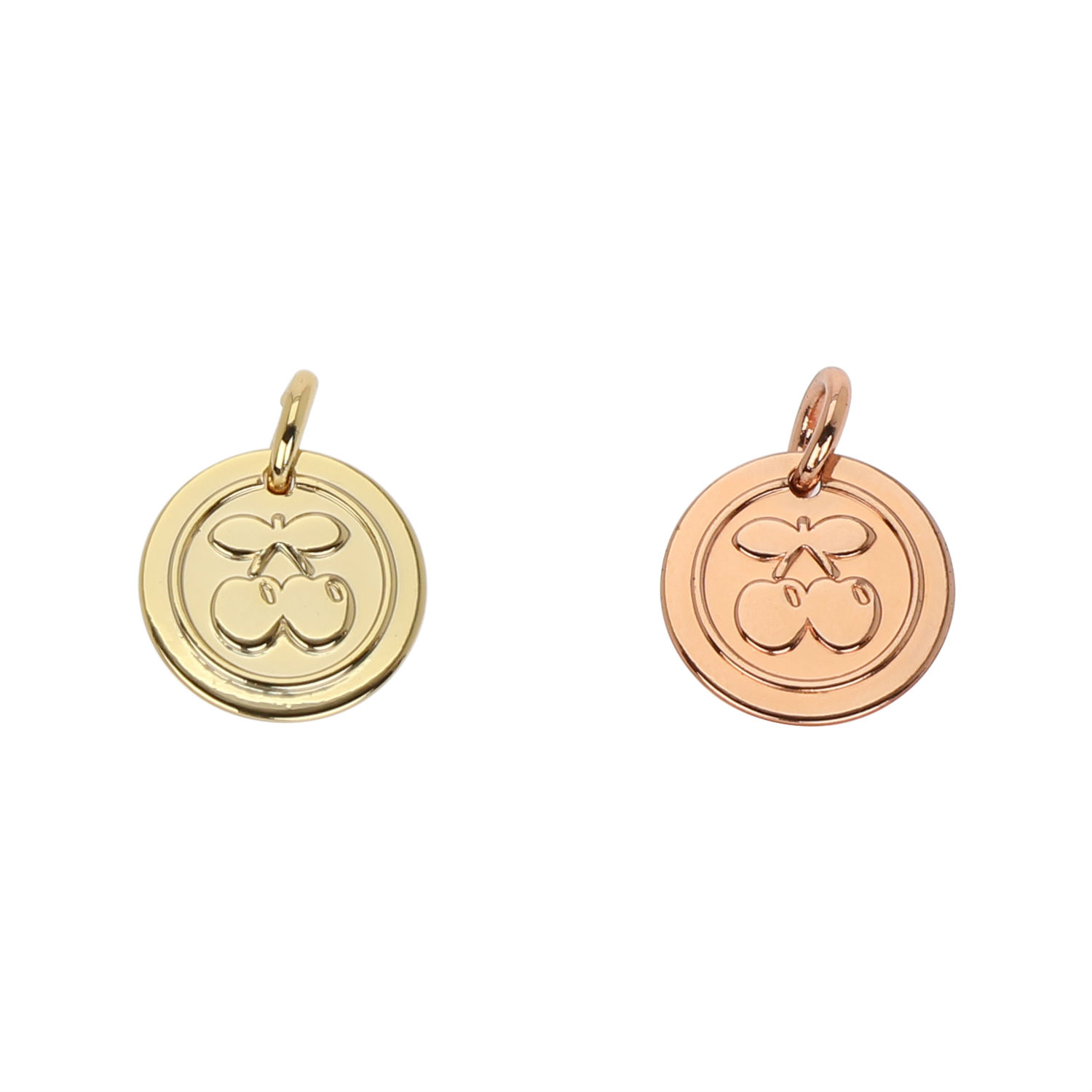 This brass charm comes in a round shape and has a ring on top for attachment. It has a shiny HP plated exterior and is adorned with a cherry logo. The cherry charm flaunts meticulous workmanship and is excellent for decoration use.