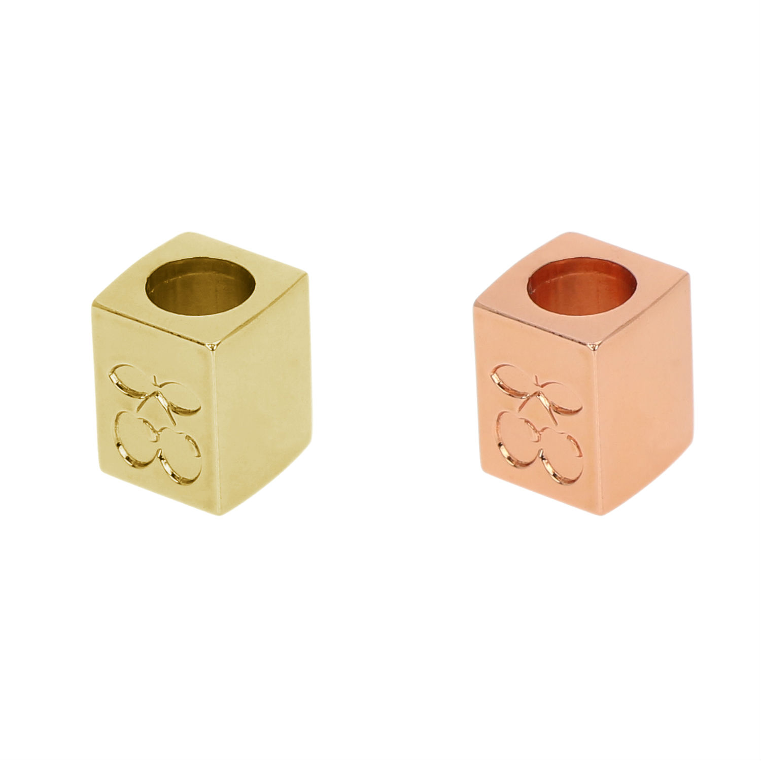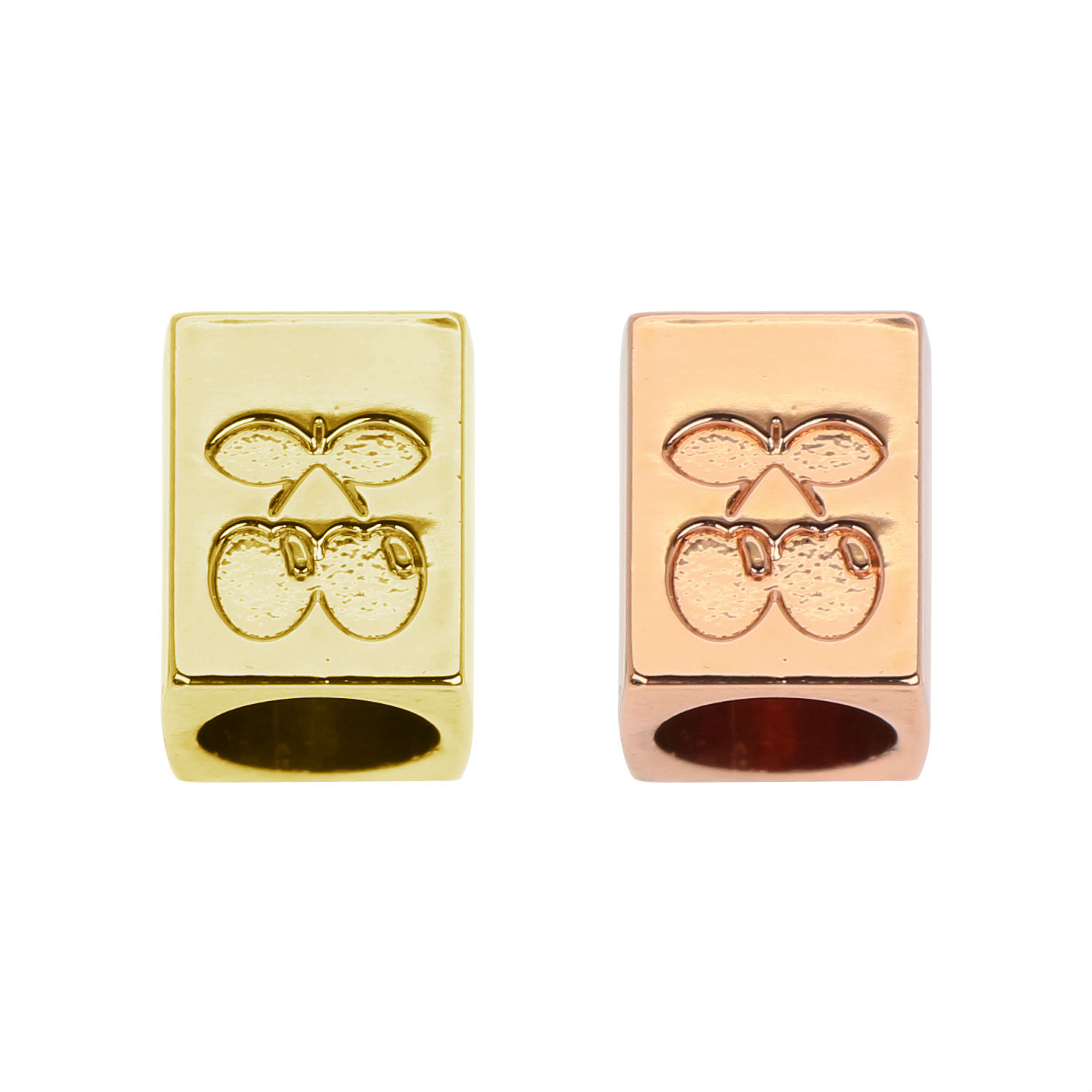 Add a shimmering touch to the garment or accessory items with these high-shine cord ends. Crafted of durable alloy, the\ cubes are detailed with a cheery engraving to leave a subtly adorable touch. They come with a large circular hole in the center for adapting chunky cords.