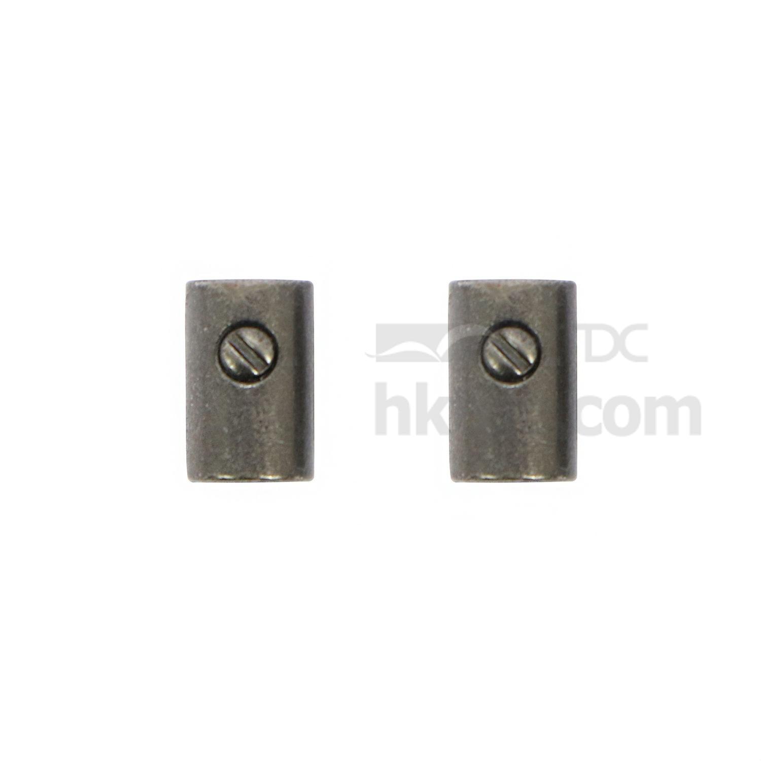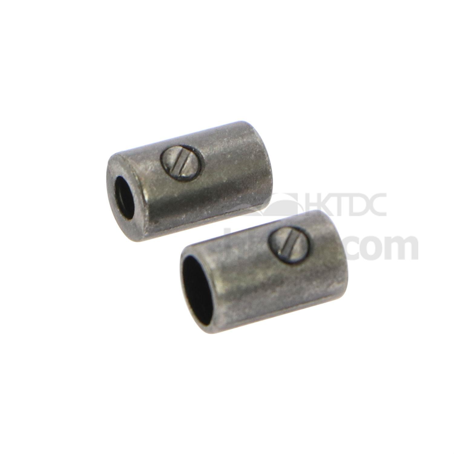 This cord end stopper is made of alloy and has a plated finish. It is cylindrical shaped and has a screw for attaching to cords and straps. The cord end stopper is available with holes in different sizes to fit different cords and can be used to add a vintage touch to garments and bags.