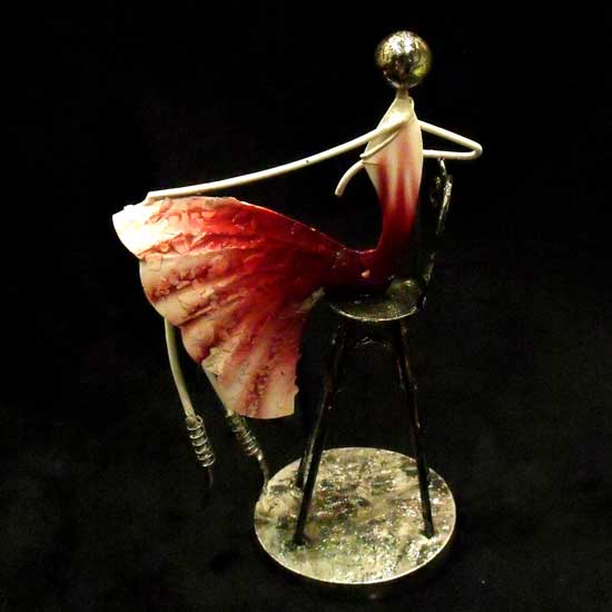 This gorgeous decoration features a seated girl outlined by twisting metal wire. The dress comes in a red hue. This beautiful ornament undoubtedly adds beauty of exceptional vividness to your home.