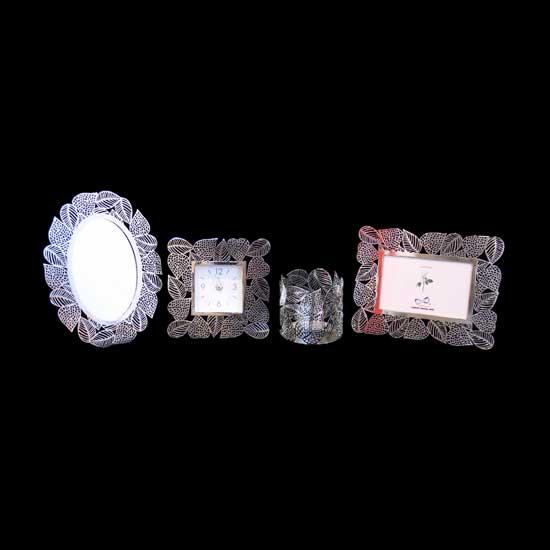 This is a decoration set including a candle holder, a clock, a mirror and a photo frame. This decoration set is made of high-quality metal for added durability. This set comes with a delicate stamped leaf design for an eye-catching look.