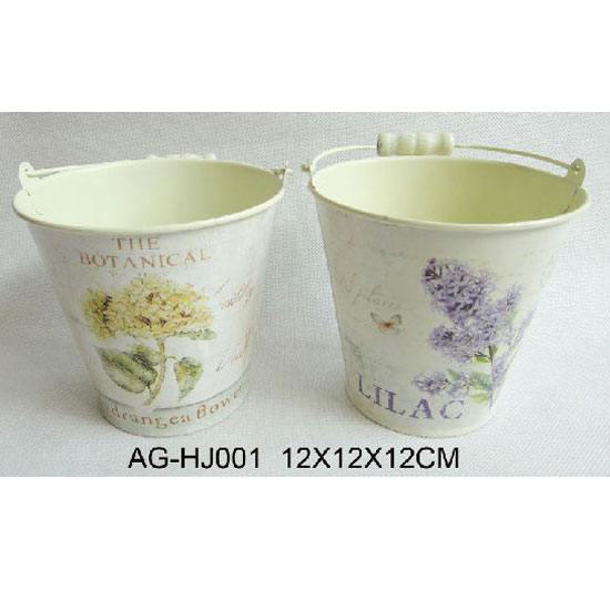 This metal flower pot is designed with charming floral patterns in soothing colors. The round handle allows users to carry it easily. Designs with different floral detail are available.