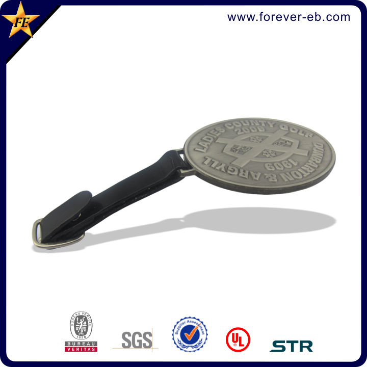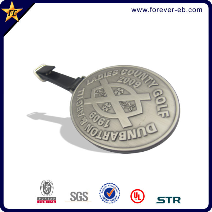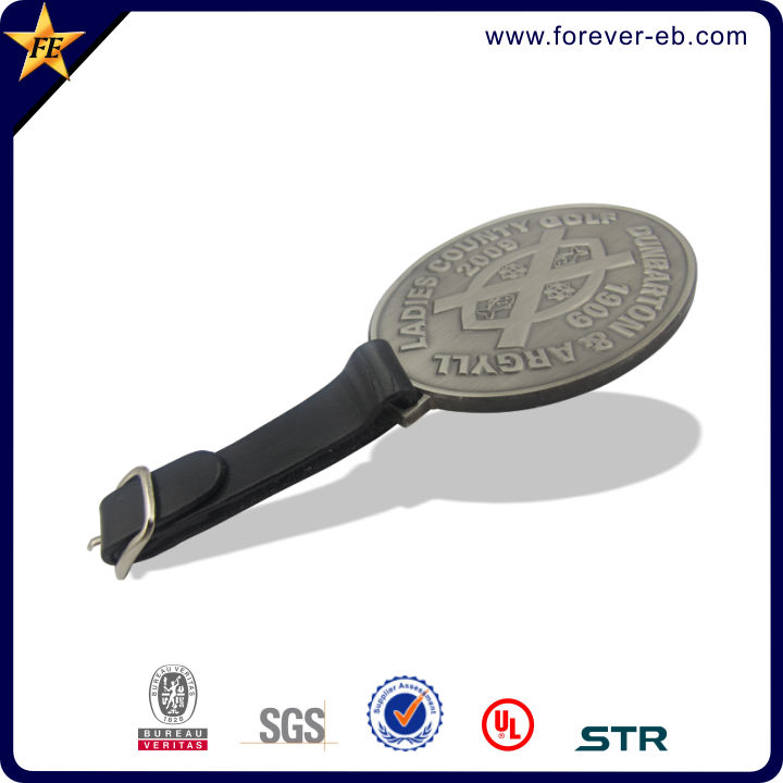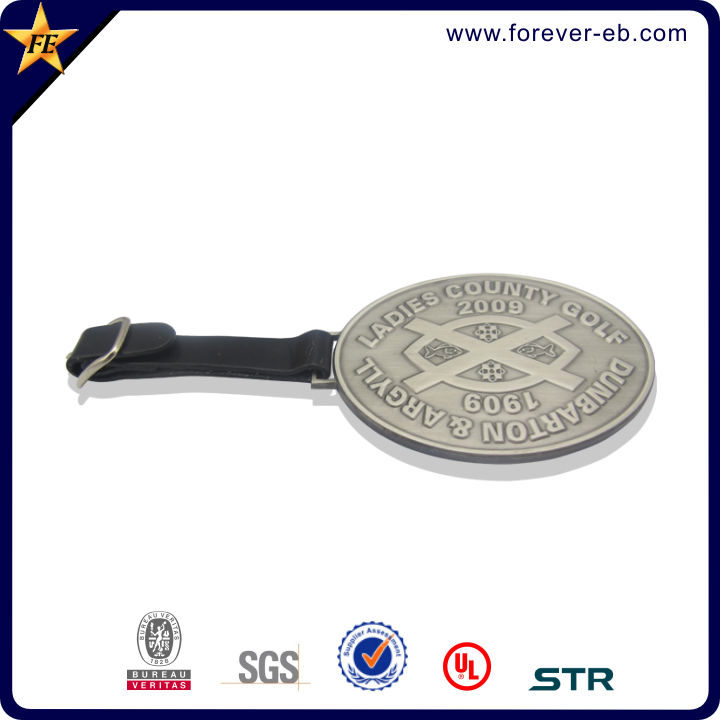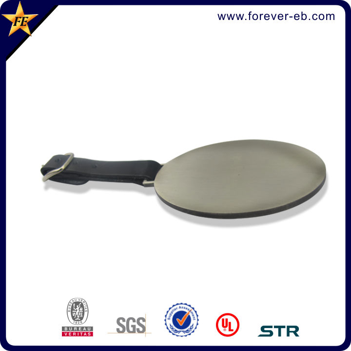 This metal luggage tag sports an oval silhouette fixed with a strap for attaching to the handle of your luggage or suitcase. The front surface is crafted with appealing patterns to decorate your luggage bag. This metal luggage tag offers a convenient means to make your luggage easy to identify.