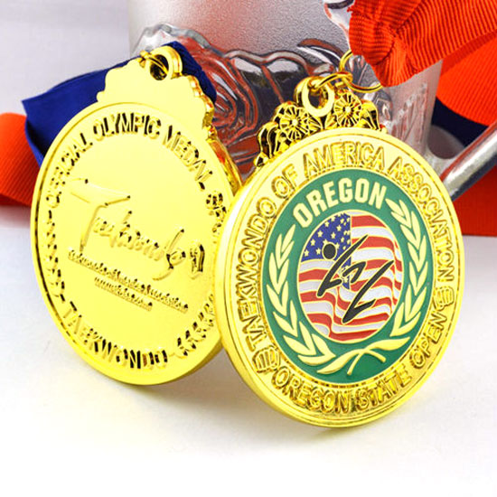This is a medal in a round shape with golden plating. It is made of quality metal for a durable structure. This item is designed with exquisite and sophisticated embossed patterns in brilliant colors.