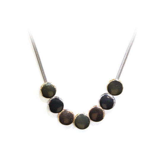 This is a necklace coming with plating in 3 tones. It comes with 7 circular, consecutive pendants in black. The delicate size and nice craftsmanship make it an ideal gift for your loved one.