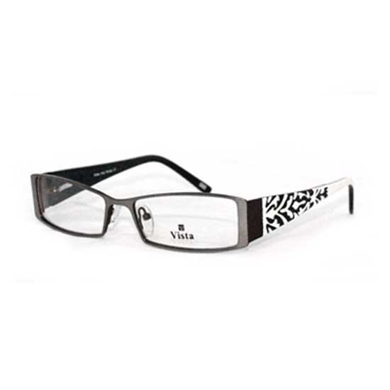 This metal optical frame features an angular shape that is smart and urban. The temple arms are accented with black and white floral patterns. This well designed frame is lightweight, durable and comfortable to wear.