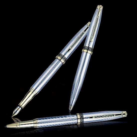 The featured metal pens boast exquisite designs, including ball pens and a fountain pen. Each item is plated with premium colors. The barrels are decorated with various patterns.