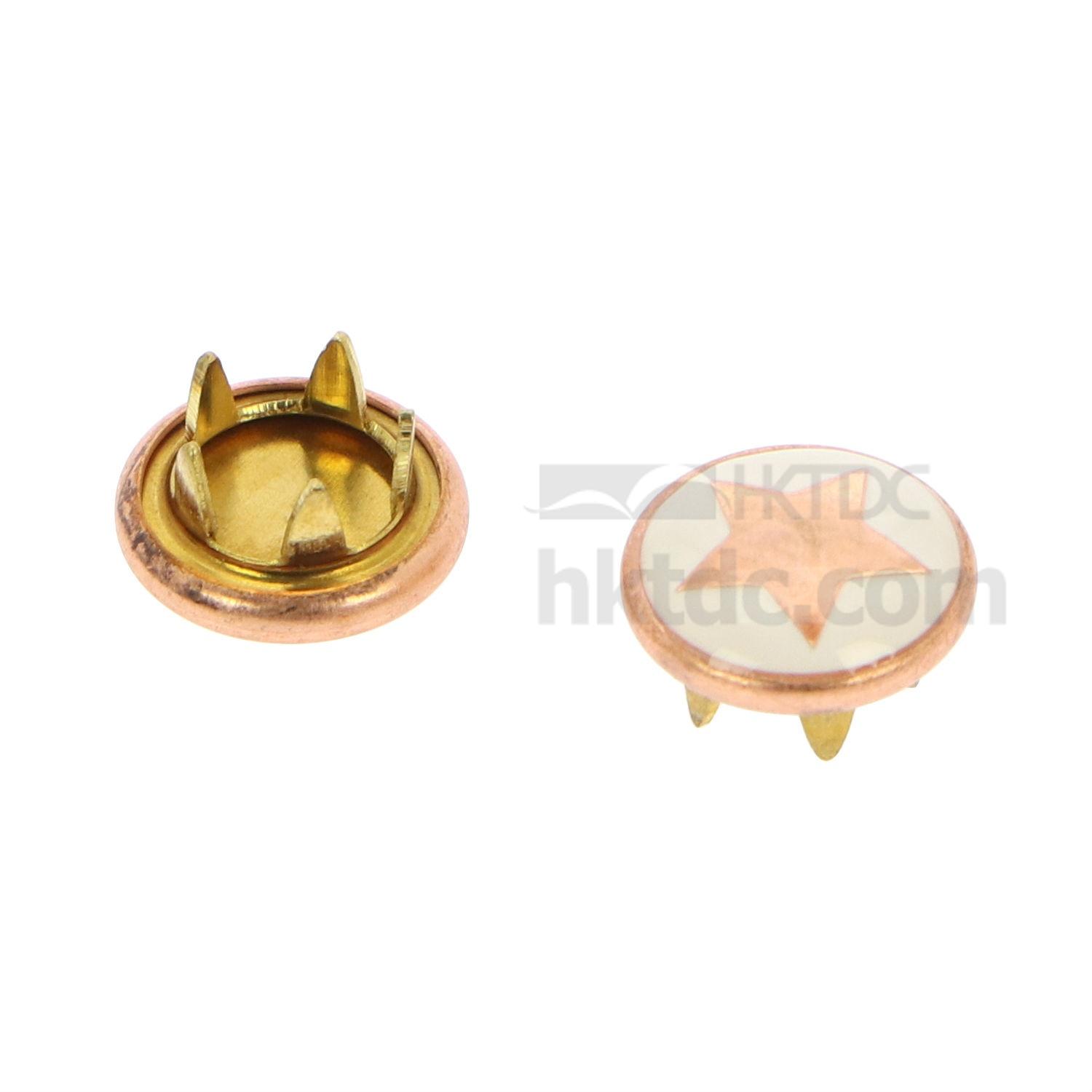 Accessorize clothes, jeans, bags and more with this metal ring snap button. It has a round body in gold tone and is decorated with a star on the surface. This brass button comes in a five-prong design and is easy to attach and remove.