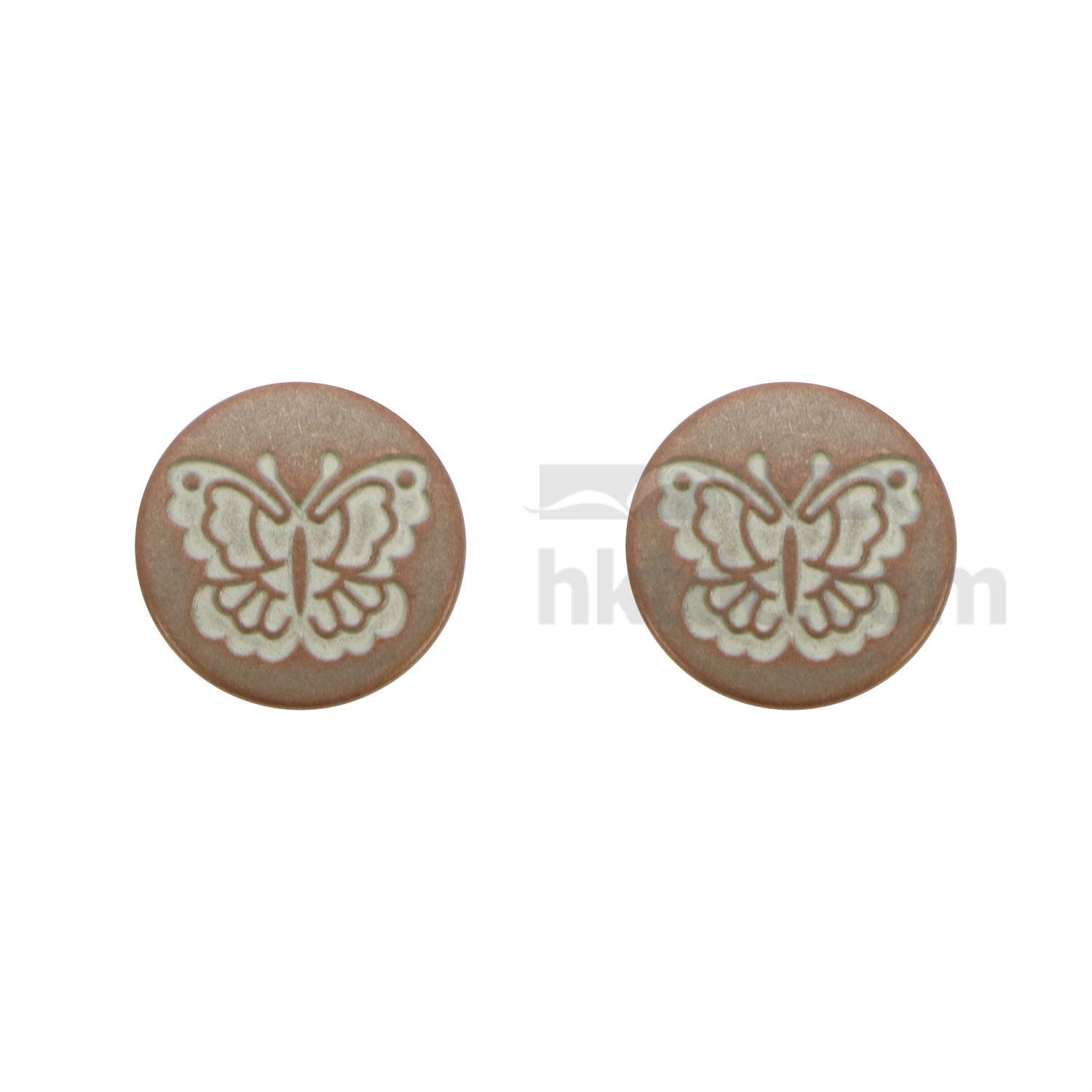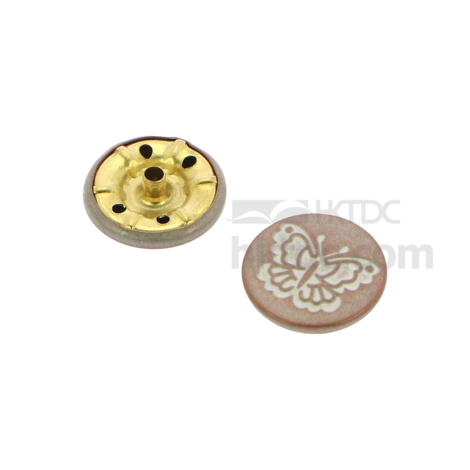 Provide quick and secure fastening for garments, bags and more with this snap button. It comes in a round shape and is decorated with a butterfly logo on the exterior. This brass button has a post at the back for easy application and is sturdily constructed for long time use.