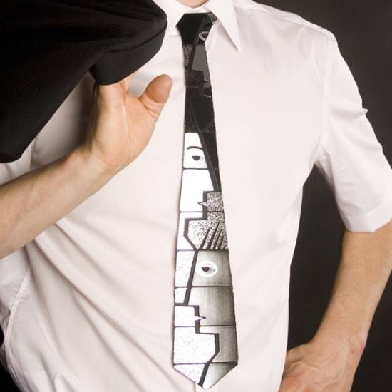 The innovative men's tie boasts a metallic surface with figures in surrealistic style. The lustrous appearance conveys a sleek feeling while not neglecting your professionalism and confidence. Transforming the traditional tie into an unconventional and extraordinary accessory, this men's tie is perfect for matching your casual clothing.
