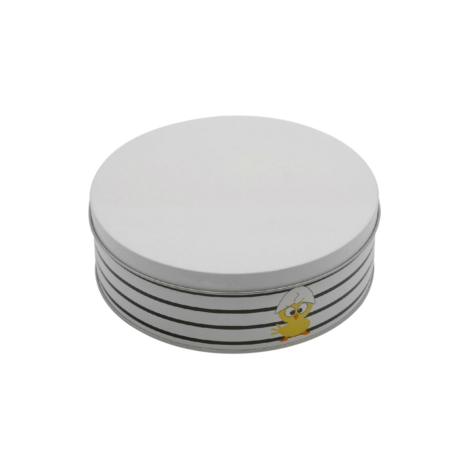 A nice choice for packaging gift like candies, cookies, or more, this metal tin sports an attractive look in nautical stripes with a lovely chick print. It is robustly constructed in a shallow round contour. Coming with a cover, it keeps the content from dust, dirt, and impacts for better preservation.