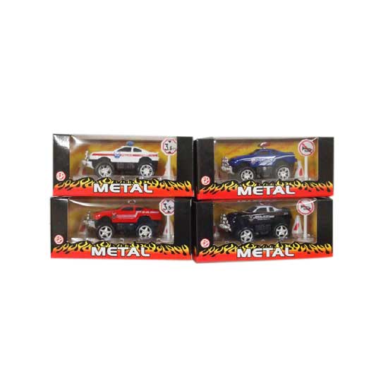 Displayed is a metal toy car that comes in a police car shape with oversized tires. Made of die-cast metal, this toy car is robust and durable. The box also includes accessories like toy road signs for additional fun.