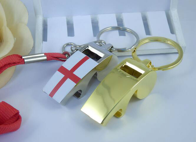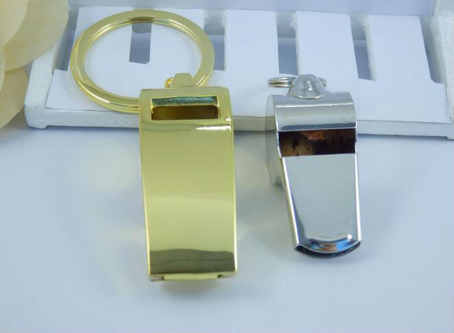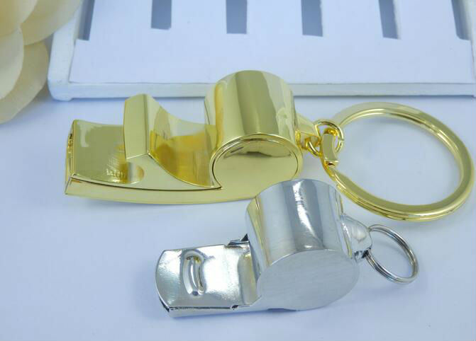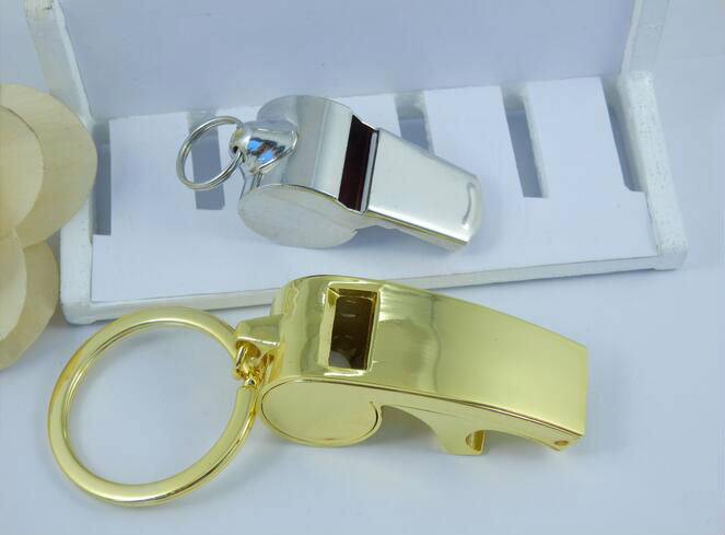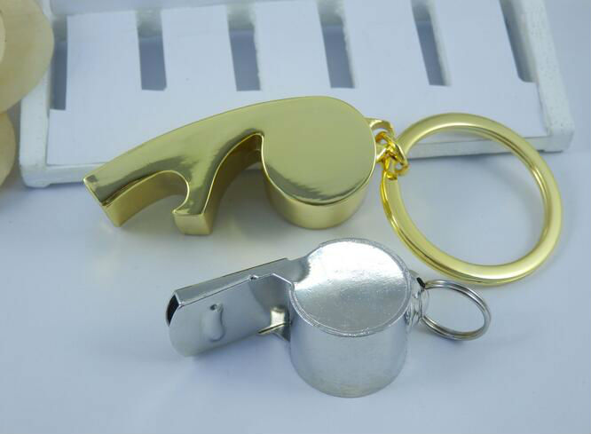 metal Whistle bottle opener keychain displayed is made of zinc alloy material