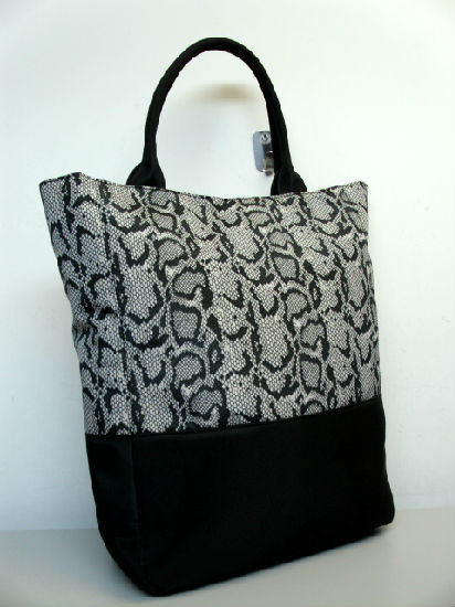 Displayed here is a microfiber tote bag with plain microfiber and python skin pattern prints. It has a large main compartment and can offer lots of space for storing your belongings. This classy and elegant tote bag has two microfiber tubular handles and is comfortable and convenient to carry.