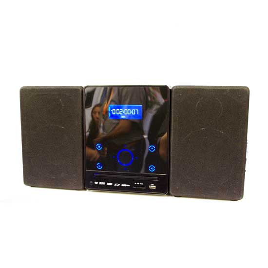 This mini Hi-Fi system features a sleek and stylish control panel with a glossy and reflective surface. The speakers are engineered for crystal clear sound with good intensity.