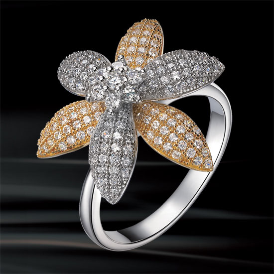 This gorgeous ring features the design of a six-petal flower with micro-pave setting. The ring band exhibits a highly polished finish for added appeal. This elegant two-toned flower ring is suitable for wearing on all kinds of occasions.