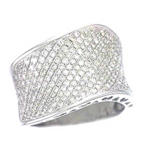 The asymmetric design of this ring suggests style and fun for ladies. Its surface is micro-paved with twinkling white diamonds. The ring makes a nice addition to your jewelry collection.