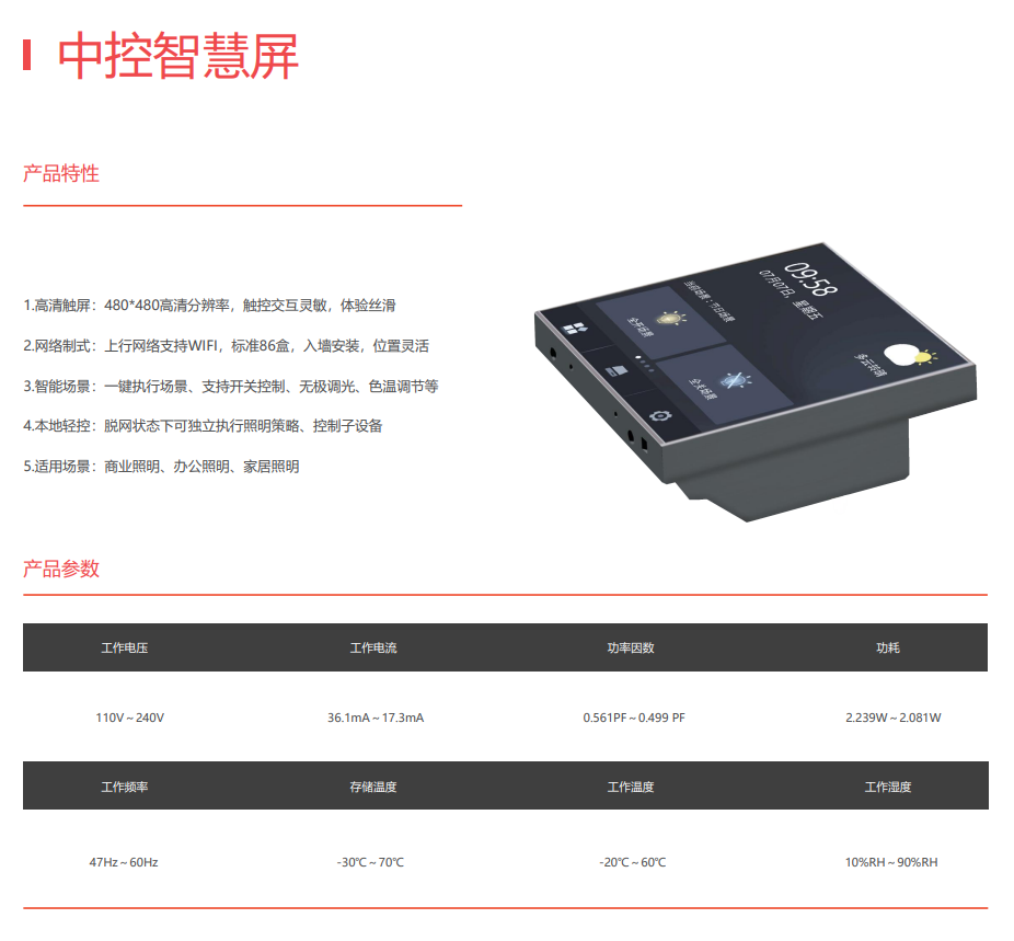 MN-K60C Smart Touch Screen features a built-in Wi-Fi module, allowing configuration of the touchscreen through cloud connectivity. The touchscreen enables local control of light fixtures for on/off switching, dimming, scene deployment, and PLC intelligent power switch control. Users can also achieve remote lighting control through a mobile app, PC browser, and other methods.