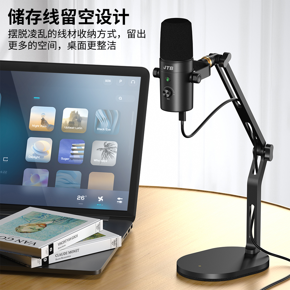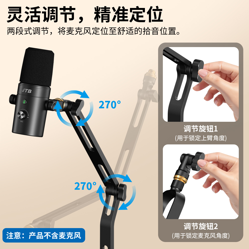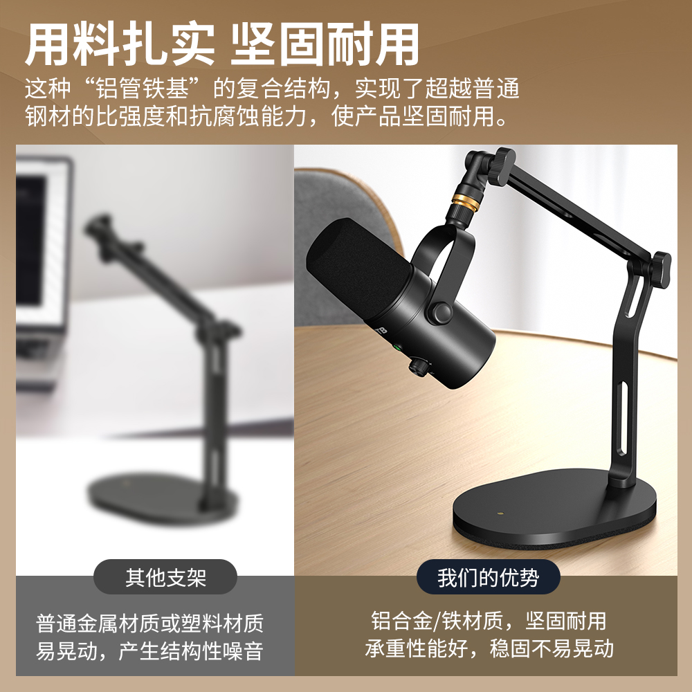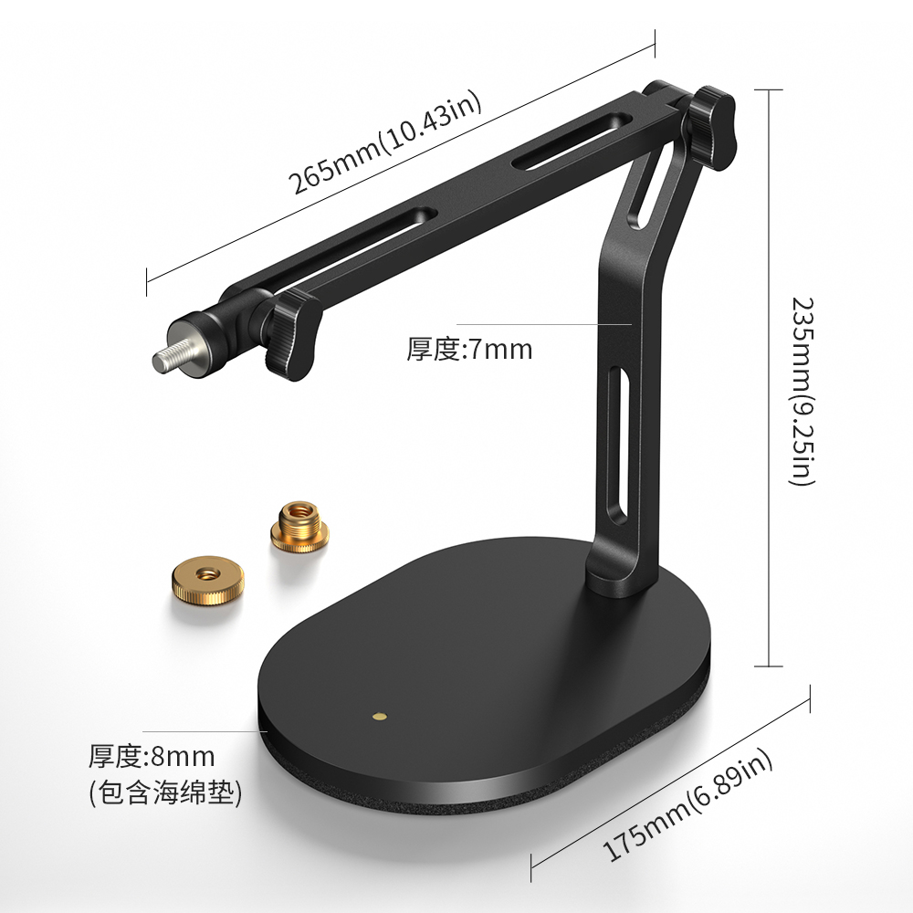 The stand is made of a composite structure of "aluminum tube and iron base," achieving a specific strength and corrosion resistance that surpasses ordinary steel, making the product sturdy and durable. The stand can bear a weight of 1kg, easily supporting common dynamic and condenser microphones, ensuring stability even under maximum load, effectively preventing issues such as top-heavy or accidental tipping due to excessive equipment weight. Equipped with two-stage adjustment, it supports a wide range of angle adjustments. According to the height of the desk and recording habits, position the microphone at a comfortable pickup position. The tube's cable slot design allows for convenient cable storage, eliminating the need for messy cable management and freeing up more space for a cleaner desk. The stand is compatible with microphones, phone holders, and fill lights with 5/8" and 3/8" adapters