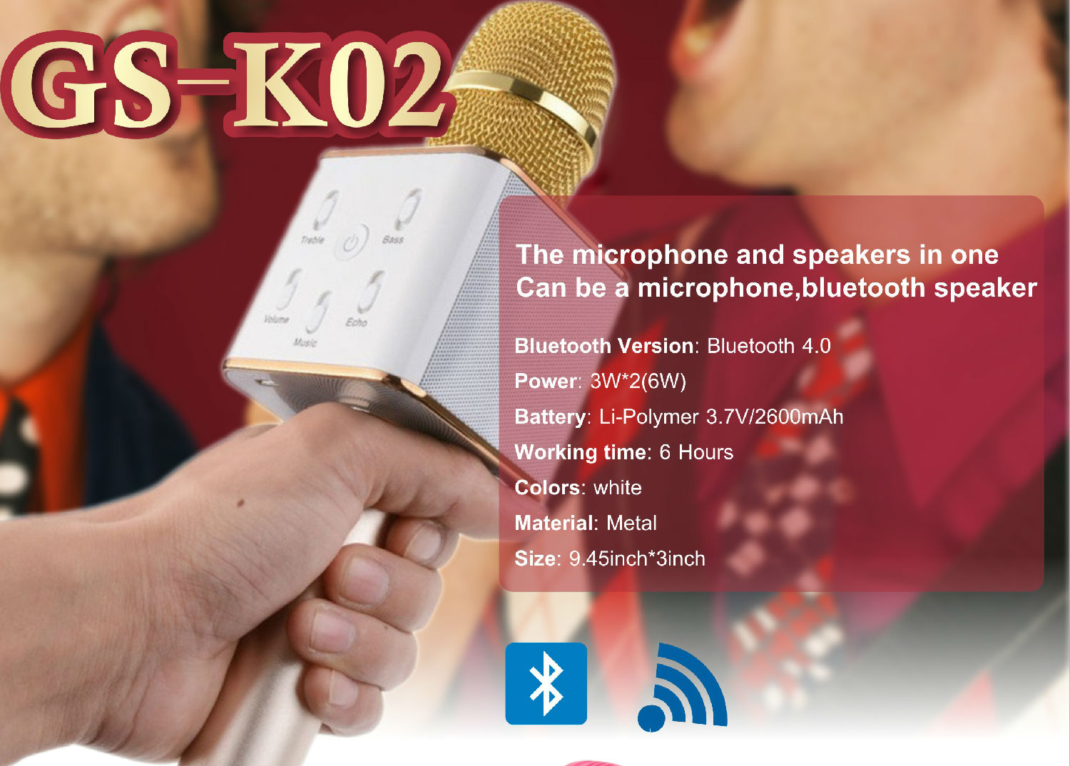 Bluetooth Version: Bluetooth 4.0 Power: 3W*2 (6W) Battery: Li-Polymer 3.7V / 2600mAh Working time: 6 Hours Colors: white Material: Metal Size: 9.45inch*3inch Frequency Range: 100HZ