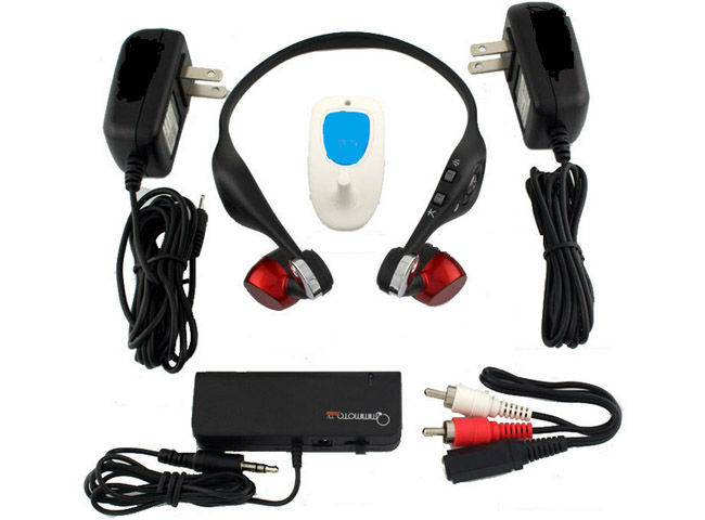 one transmitter;one headset;two charger for transmitter &receiver separately;one pothook to easy charging;transmission cable (red&white);one pc taps to fix the transmitter onto TV;one instruction;one packing box