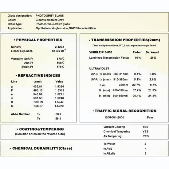 The photochromic blank turns from clear color to medium gray under exposure to sunlight. It provides full protection for your eyes from the harmful ultra-violet. The lens has undergone precise tests to ensure safety and comfort for wearing.