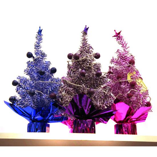 The featuring items are three mini tinsel Christmas trees to be put on table and shelf for indoor decorations. The trees are embellished with gold chains and balls, with their bases wrapped with glossy paper.