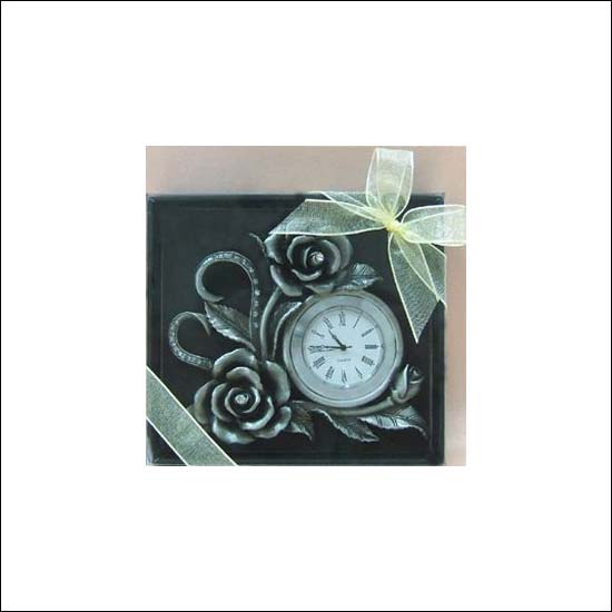 This is an elegant pewter rose mini clock with a deluxe box and organza ribbon