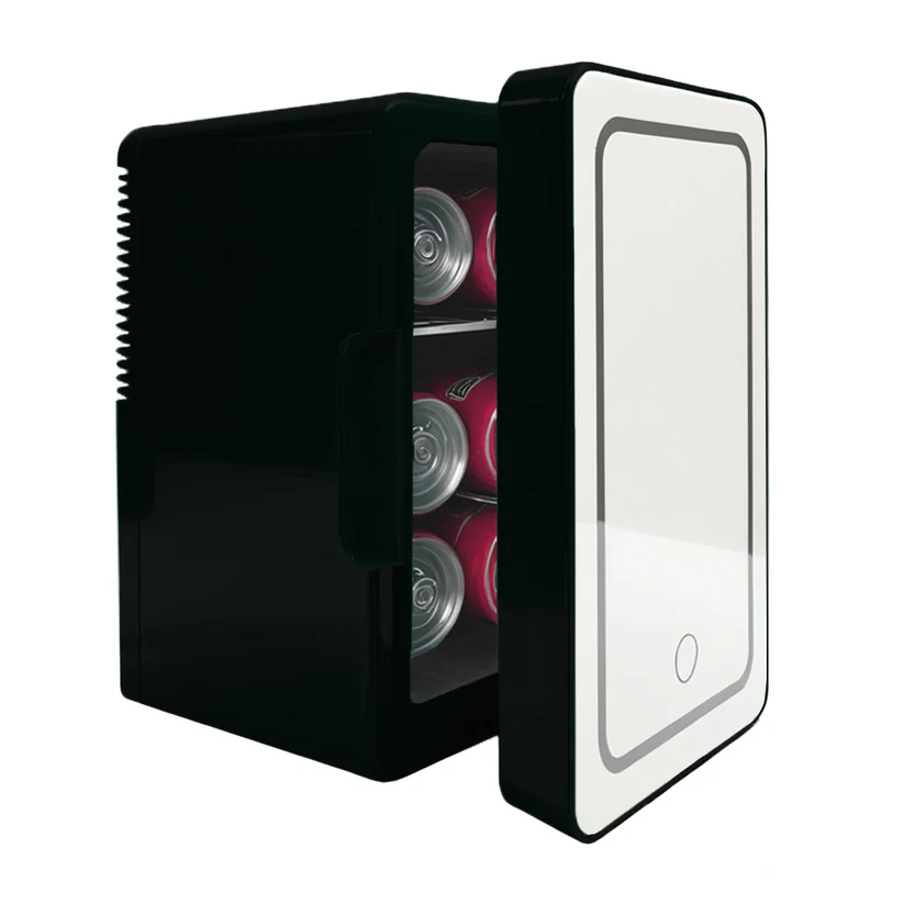 Led Lighted Mirror Door: This cosmetic fridge features a mirror on the door and is equipped with bright LED lights, allowing you to touch up your makeup anytime, anywhere.