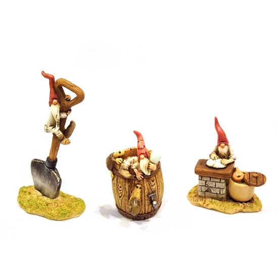 Shown here is a set of mini gnome decorations coming with different appealing models. The gnome wears a white bushy beard and a worn hat doing household chores. Made of poly resin, the mini gnome decorations are ready to bring an interesting touch to your rooms.