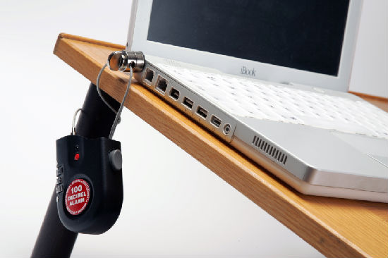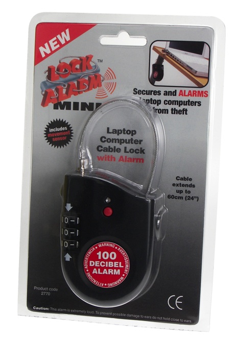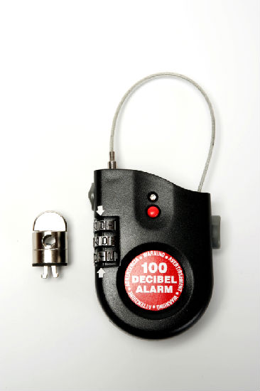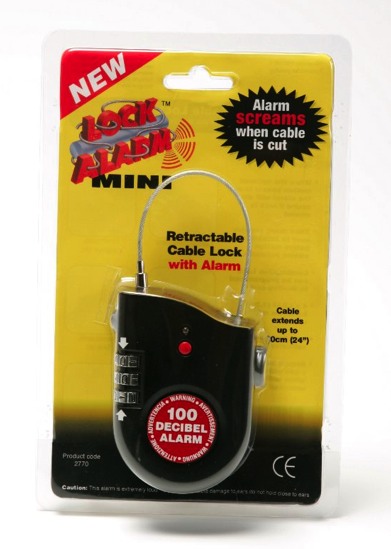 • A retractable cable lock with alarm suitable for securing your valuable items from theft.