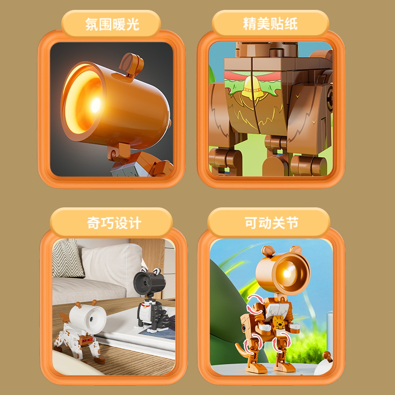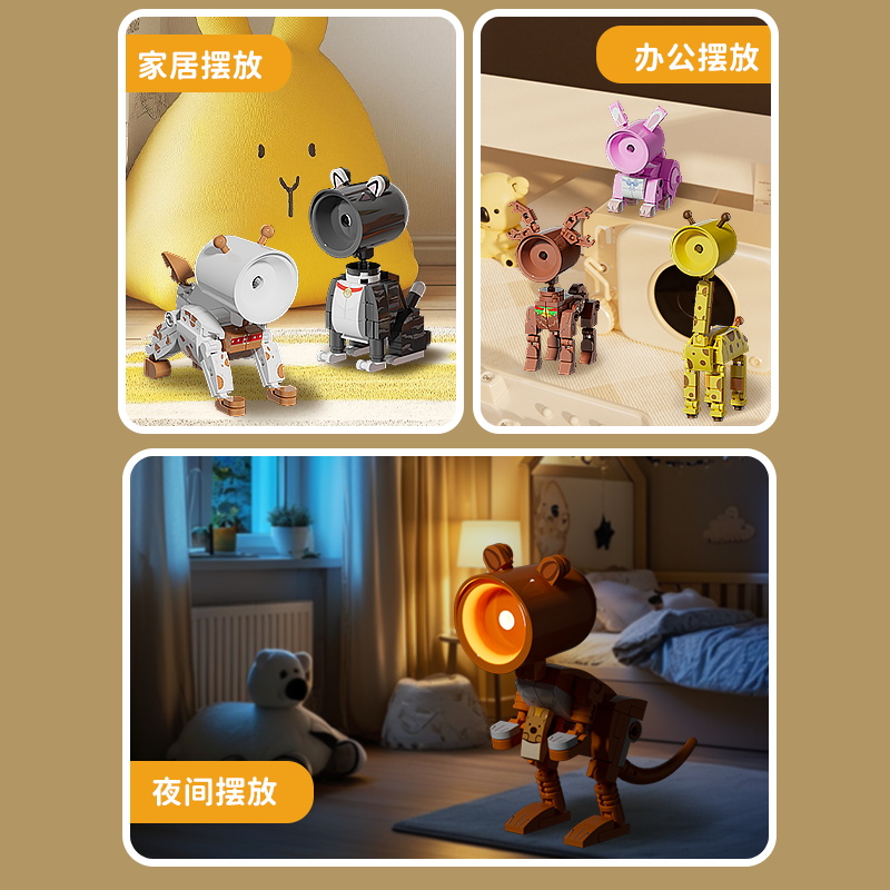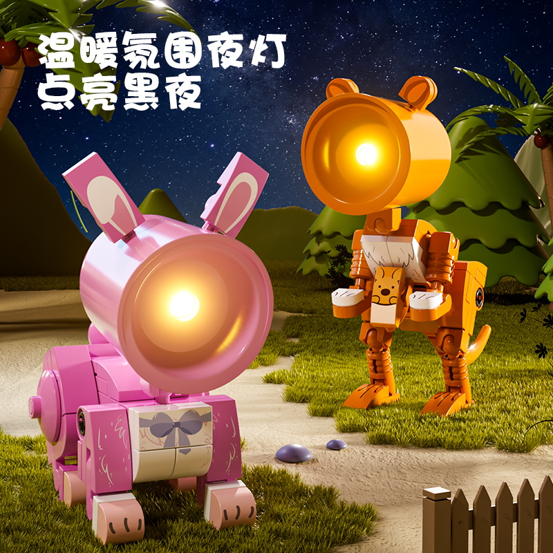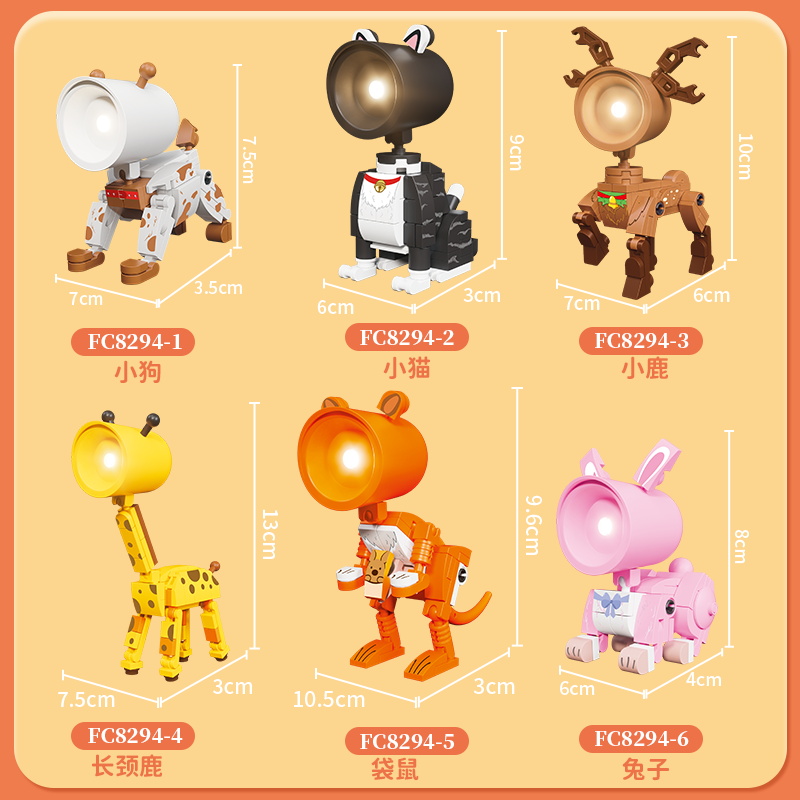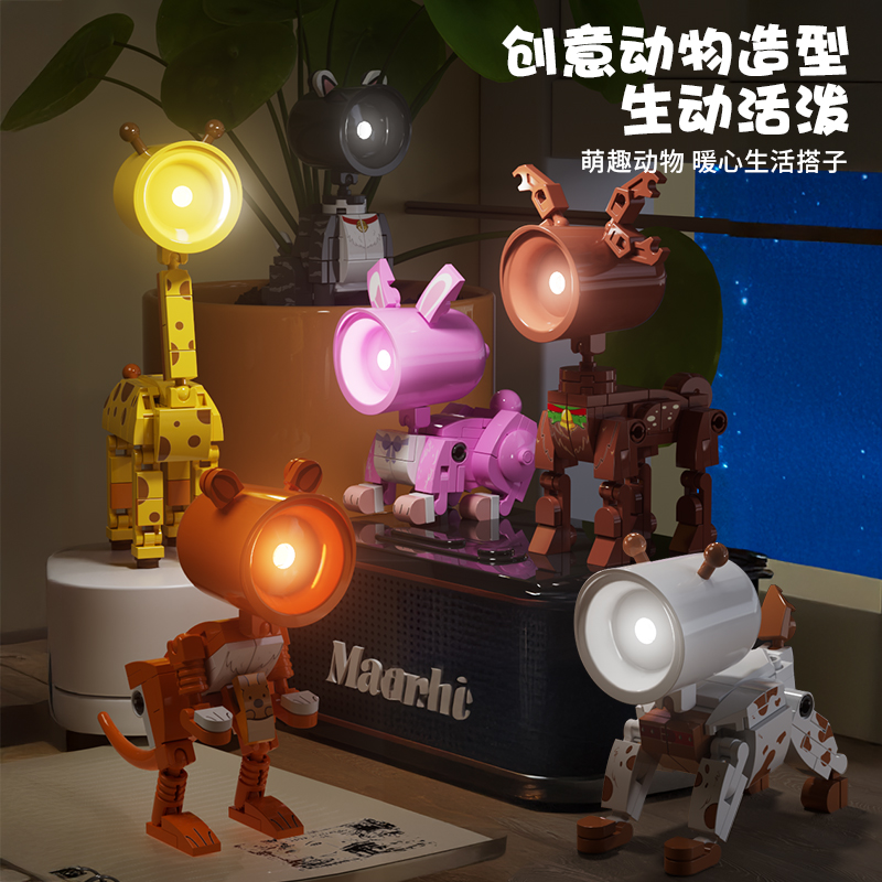 6 plastic building block night lights, themed with animals including rabbit, dog, cat, giraffe, kangaroo and deer.