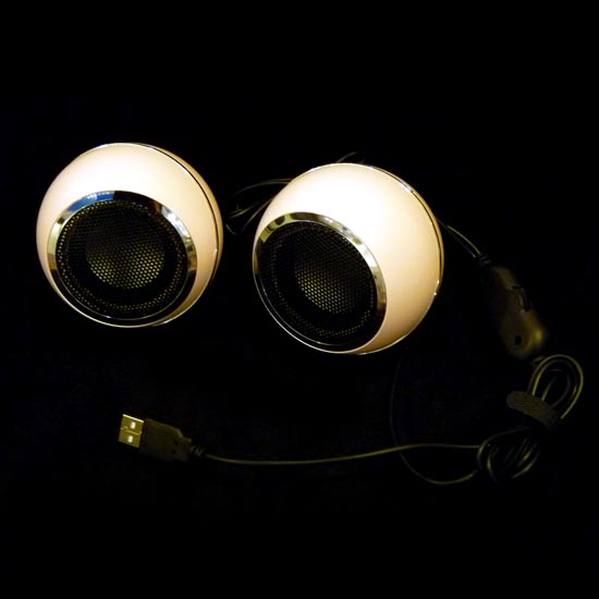 Presented is a pair of loud speakers designed in a cool globe shape. The speakers are plated in white and decorated with shiny silvery details. The built-in USB port allows connection to laptop computers for playing digital files.