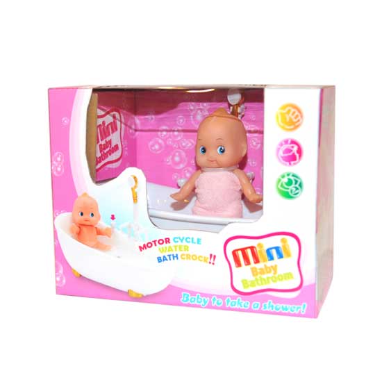 The displayed mini toy baby bathroom set includes a doll and a motor cycle water bath crock. It is suitable for children above 3 years. This lovely bathroom toy is sure to give your kid hours of fun.