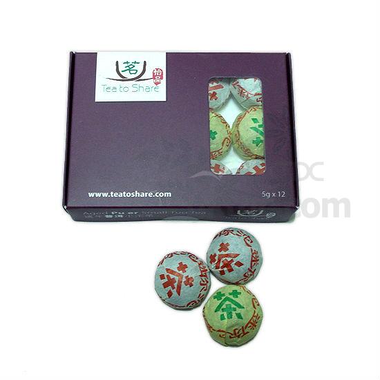 This box of Chinese tea consists of twelve mini tuo cha tea cakes ideal for use as a gift for tea lovers. Made from raw pu-erh leaves, it offers an excellent combination of taste and aroma. The compressed design allows for easy storage and handling while the tea cake is wrapped individually in paper to preserve its flavor and moisture.