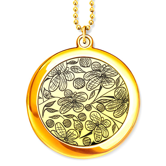 This is a mirror case in a round shape with shiny gold plating. It boasts a sliding design with a ball chain. The flowers in blossom sketch patterns add a touch of uniqueness to this design.