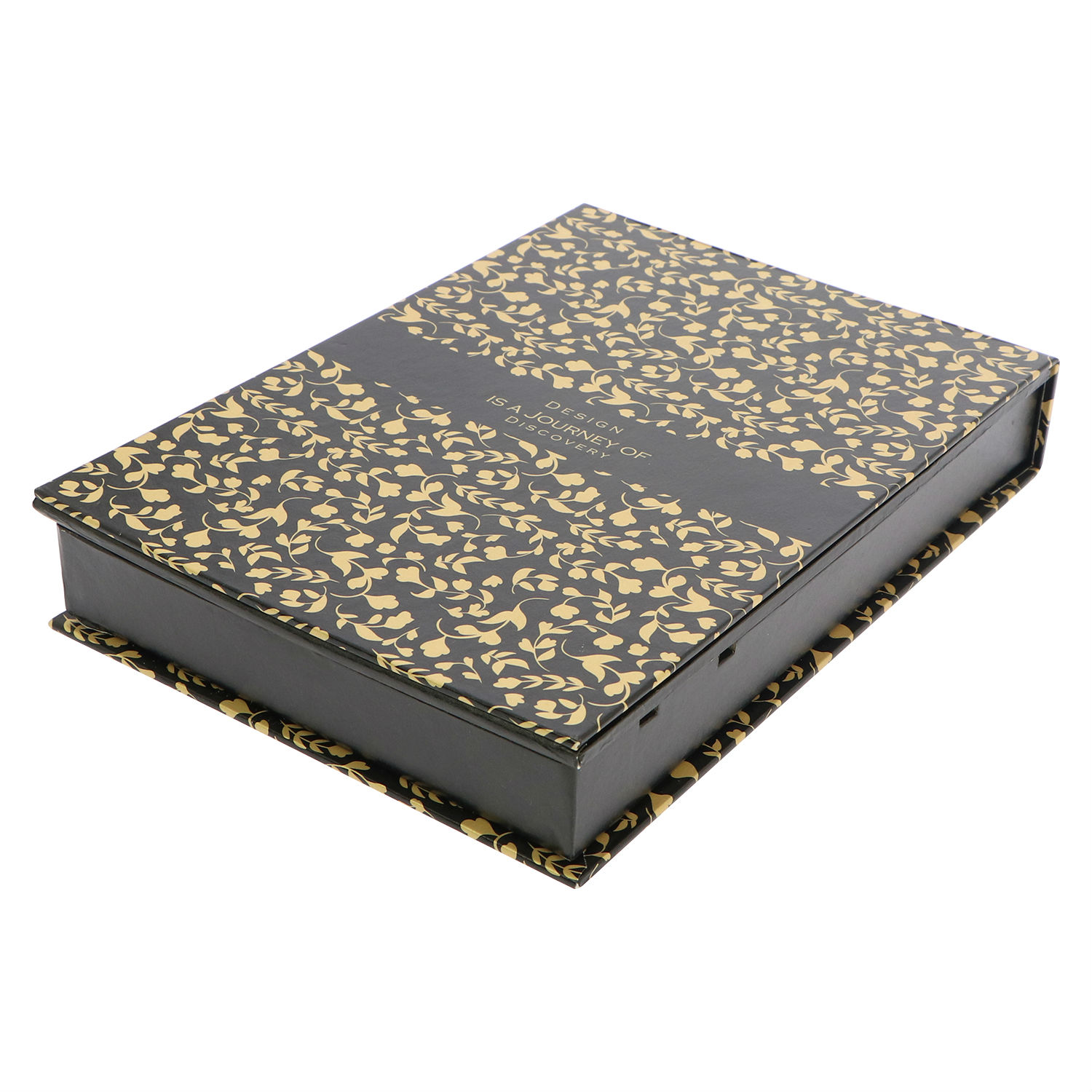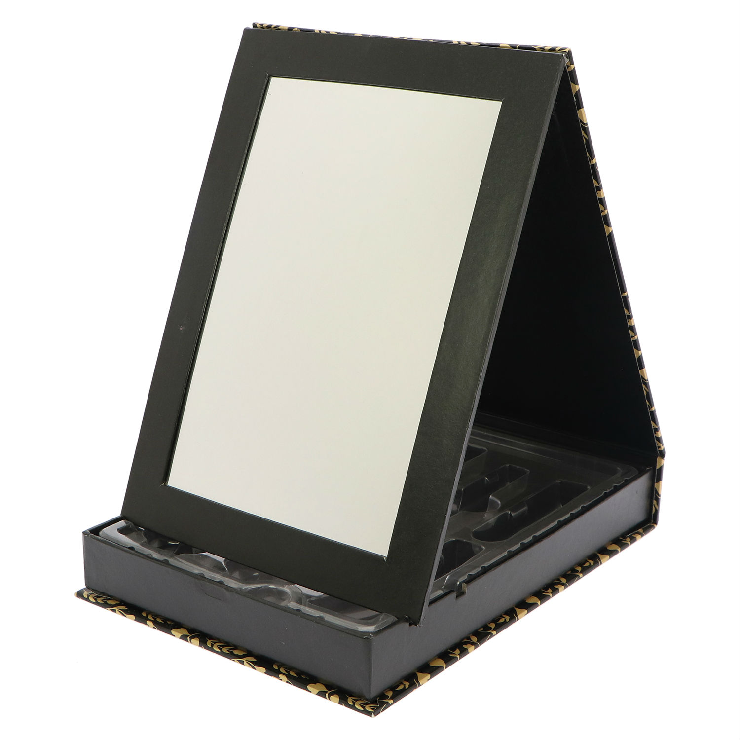 Equipped with a fold-up standing mirror at the back of the lid, this gift box is excellent for cosmetics packaging use. It comes in a compact rectangular shape and is embellished with floral patterns on the exterior. This gift box has an inner tray for holding products in place and can keep cosmetic products neatly stored.