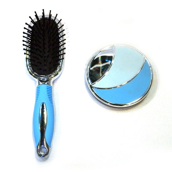 This mirror and brush set is crafted from metal, which promises sturdy construction and exceptional durability. The brush features a pale blue padded handle for a firm grip while the mirror comes in a round shape in a compact size. This grooming set is an ideal addition to ladies’ handbags.