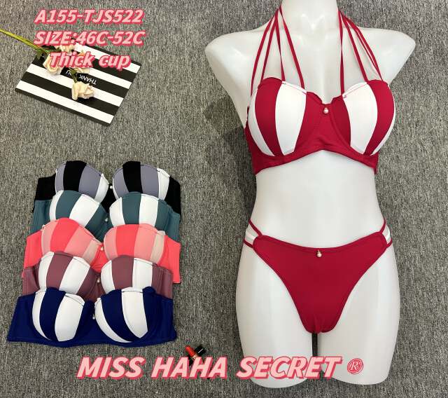 The Miss Haha Secret Thick Cup Striped Lingerie Set combines bold style and enhancement. It features thick cup padding for a lifted silhouette, a striking striped pattern, and a multi-strap halter design for added allure. The matching thong complements the bra’s design, available in colors like red-white, gray-white, teal-white, coral-white, mauve-white, and navy-white. Sized 46C-52C (code: A155-TJS522), this set offers both eye-catching fashion and supportive comfort, making it ideal for those who want to embrace a confident and stylish look in their intimate wear.