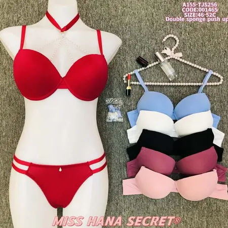 Enhance your intimate wear with the Miss Hana Secret Double Sponge Push Up Lingerie Set. This set features a double sponge push-up bra and matching panty, designed to deliver exceptional lift and a flattering silhouette. Available in sizes 46-52C (code 001465, A155-TJS256) and a range of elegant colors including red, blue, white, black, mauve, and pink, it combines style and support. The set also includes charming details like strappy accents on the panty and optional pearl embellishments, adding a touch of sophistication. Perfect for those seeking a confident and stylish look, this lingerie set from Miss Hana Secret is ideal for elevating your everyday comfort and special-occasion allure.