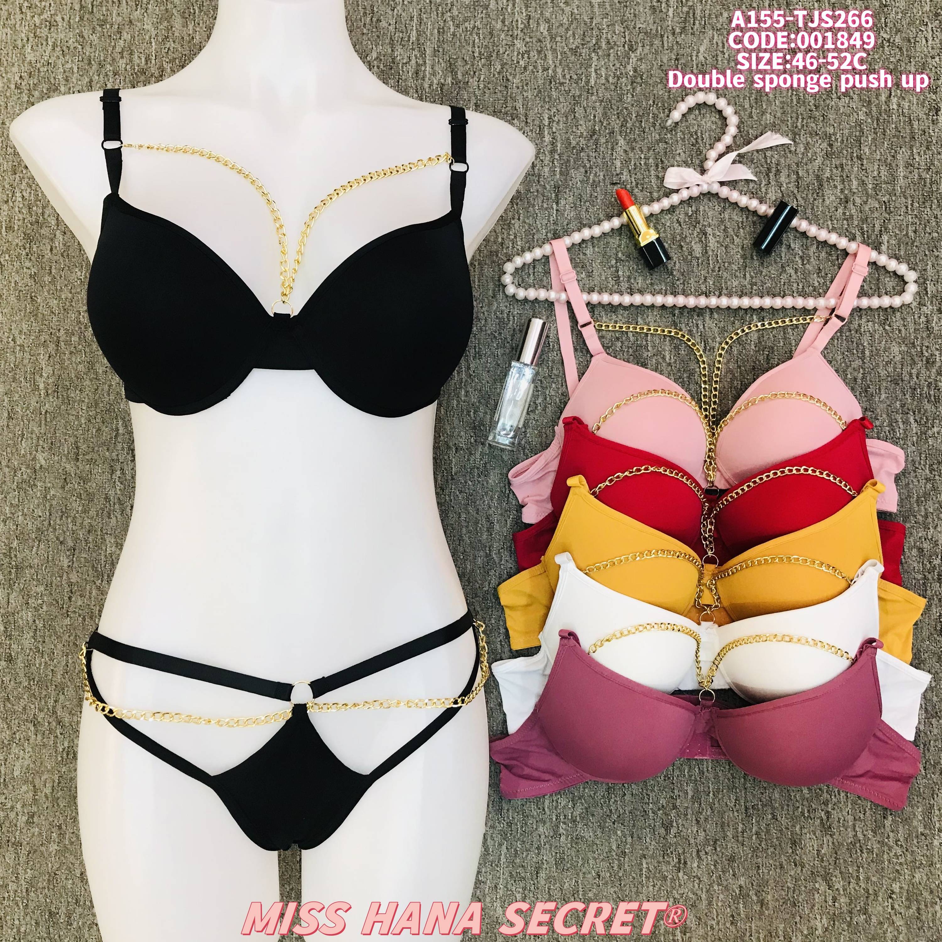 Elevate your intimate wear with the Miss Hana Secret Double Sponge Push Up Lingerie Set. This set features a double sponge push-up bra and matching panty, accentuated with stylish gold chain details that add a luxurious and bold touch. Available in sizes 46-52C (codes 001849/A155-TJS266) and a range of vibrant colors including black, pink, red, yellow, white, and mauve, it combines exceptional lift with a fashion-forward design. The push-up construction enhances your natural shape, while the chain embellishments create a striking visual appeal. Perfect for those who want to make a statement with their lingerie, this set from Miss Hana Secret is ideal for adding a touch of glamour and confidence to your wardrobe.