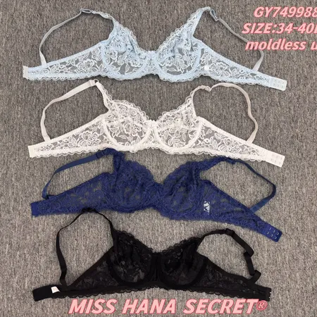 The Miss Hana Secret GY749988 Bra is a stylish lace lingerie piece designed for women, featuring a moldless up design that offers a natural yet flattering look. It is available in sizes 34-40BC, catering to a range of body types. With four elegant colors—light blue, white, dark blue, and black—this bra adds a touch of romance and sophistication to your wardrobe. The intricate lace detailing not only enhances its aesthetic appeal but also ensures breathability and comfort for all-day wear. Whether for everyday use or special occasions, this bra combines fashion and functionality, making it a versatile choice for your lingerie collection.